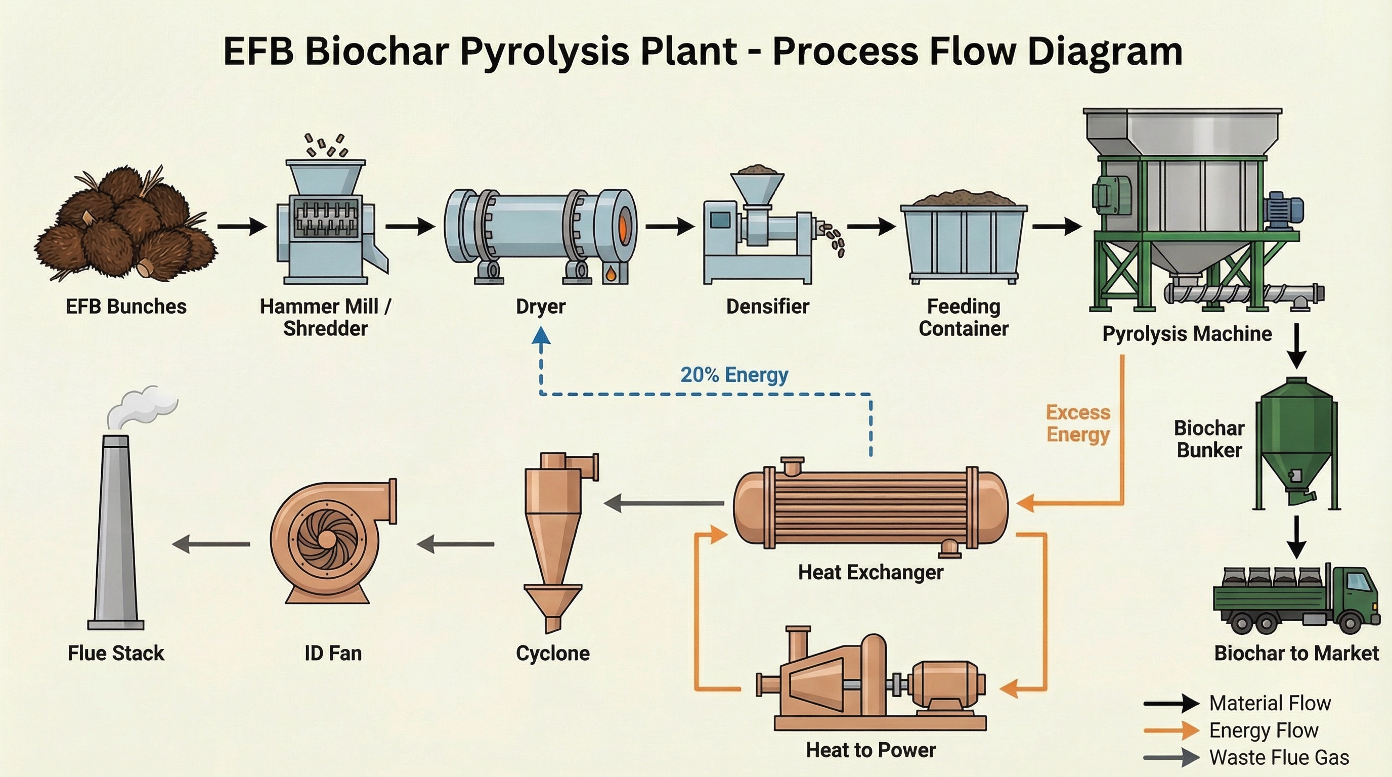 Our pyrolysis system integrates seamlessly into palm oil mill operations: